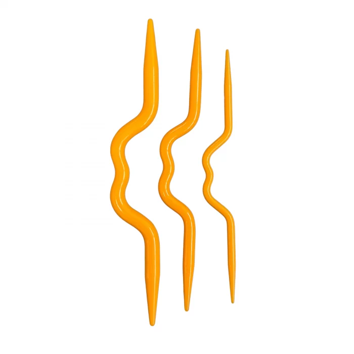 Easily create beautiful twisted textures with this set of three curved cable needles designed for security and speed. This elegant accessory provides everything you need to enjoy a relaxing and productive hand-sewing experience.