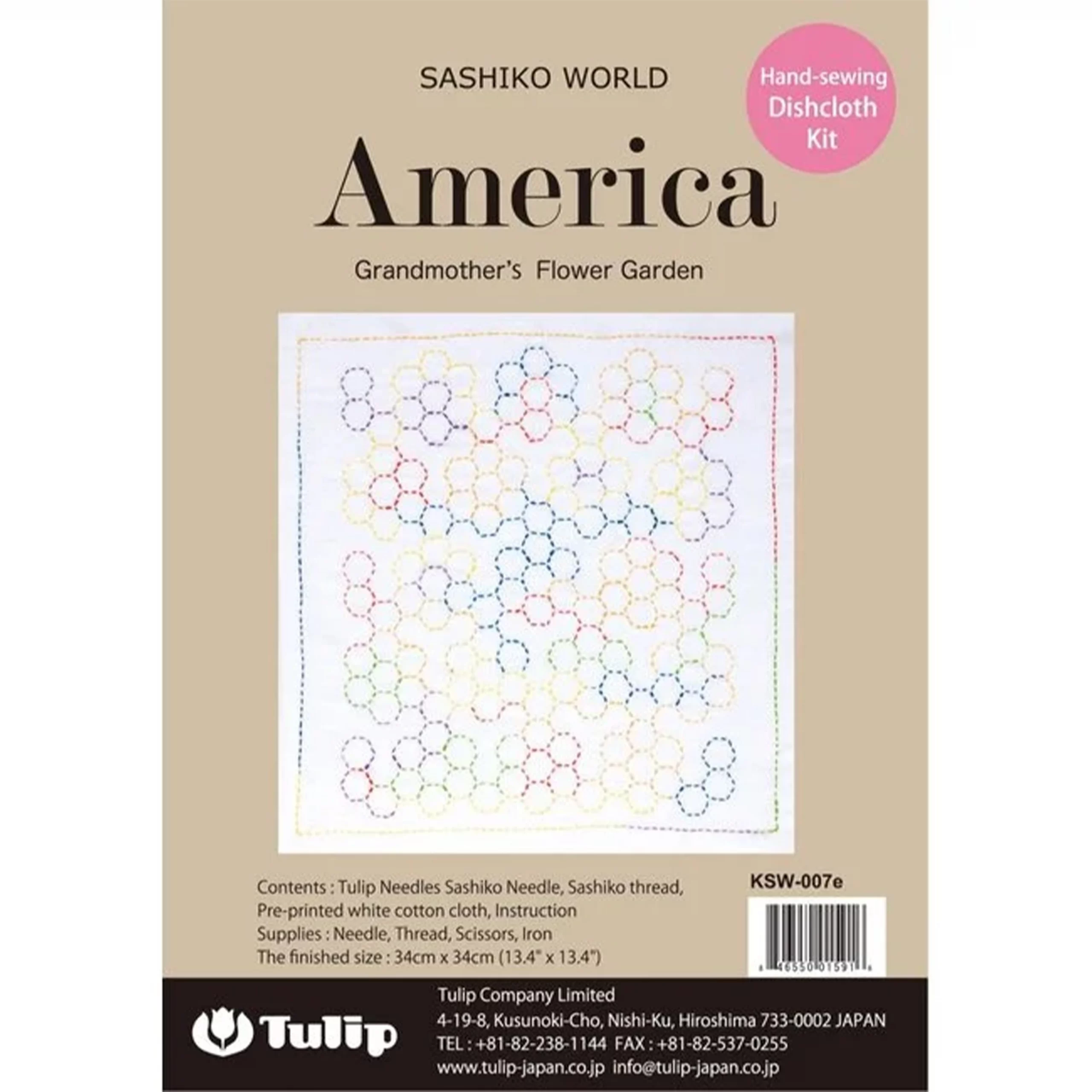 Grandmother’s Flower Garden (KSW-007E) – Tulip Sashiko Needles (1), Sashiko Thread Variegated (15), Pre Printed white cotton cloth (1) & Instructions (1)