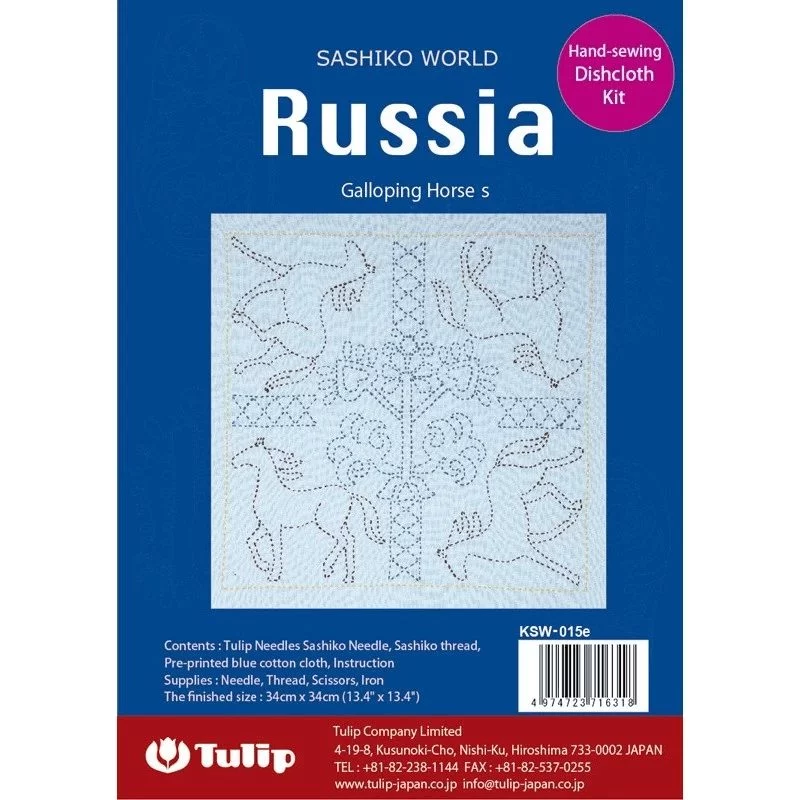 Galloping Horses (KSW-015E) – Tulip Sashiko Needles (1), Sashiko thread Red Brown (6), Cobalt Blue (6), Yellow (2), Pre Printed white cotton cloth (1) & Instructions (1)