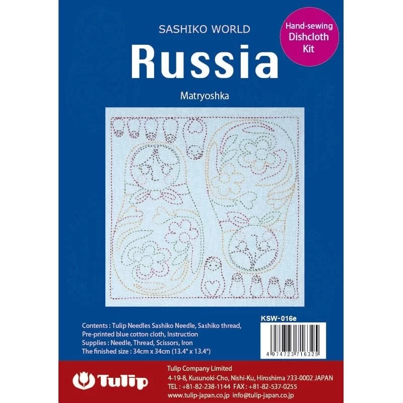 Matryoshka (KSW-016E) – Tulip Sashiko Needles (1), Sashiko thread Red (4), Variegated (10), brown (3), Pink (0.5), Pre Printed white cotton cloth (1) & Instructions (1)