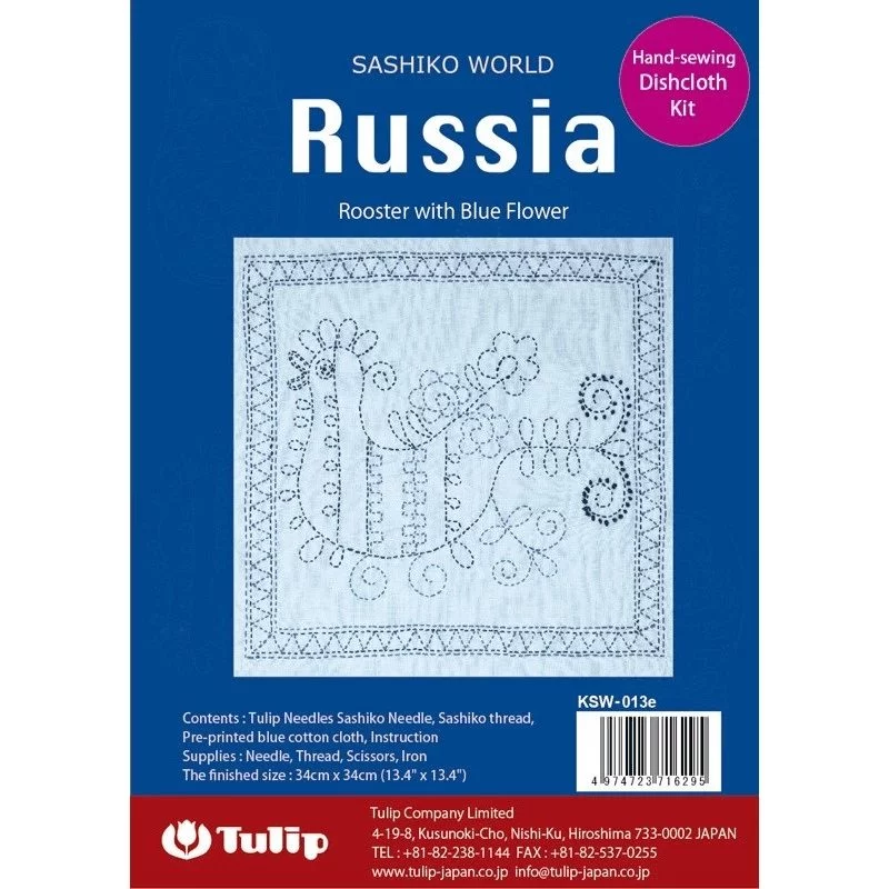 Rooster with Blue Flower (KSW-013E) – Tulip Sashiko Needles (1), Sashiko thread Navy (10), Cobalt Blue (10), Pre Printed white cotton cloth (1) & Instructions (1)
